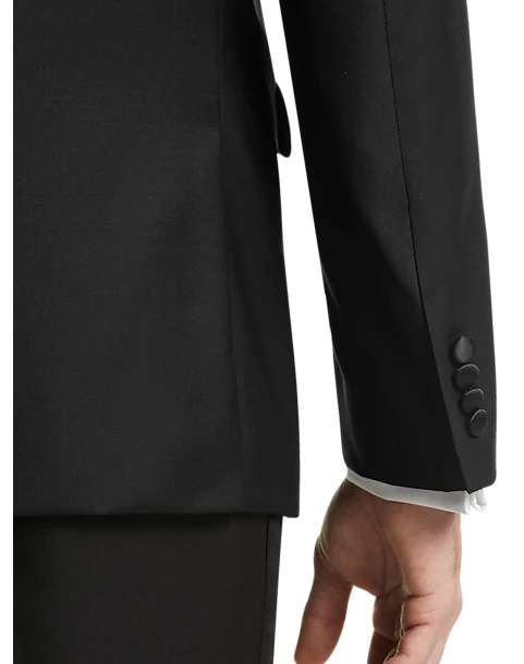 This stylish tuxedo jacket is a modern standout from Calvin Klein. Tailored in fine 100% natural stretch wool, this jacket has a smooth satin shawl collar, satin-covered buttons and satin trim at the pockets.