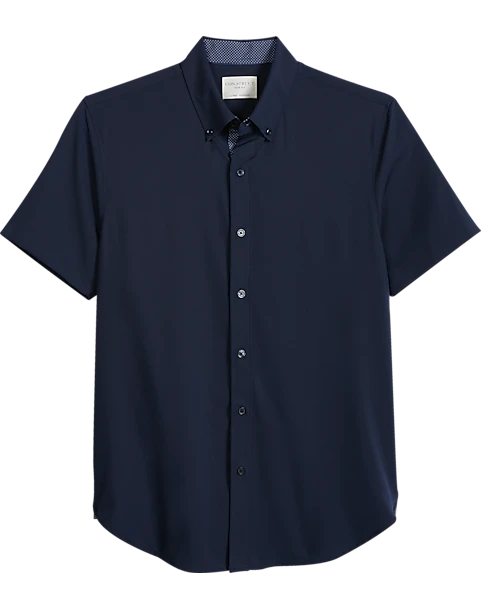 Keep your cool in the heat with this short-sleeve sport shirt from Con.Struct. Made with a breathable poly blend button-down collar and sleek Slim Fit you can pair it with shorts jeans khakis and other laid-back slacks for dressed-down perfection.