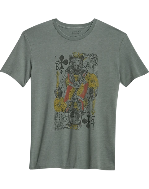 This cool and casual tee features the fun graphic of a bear who is king on a playing card over a heather olive green background.