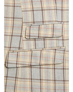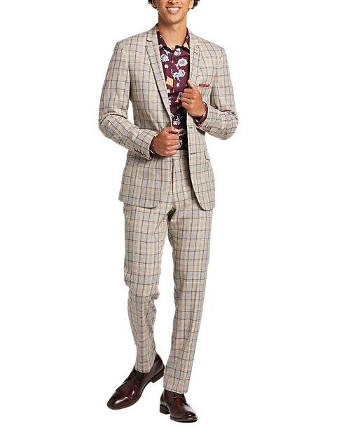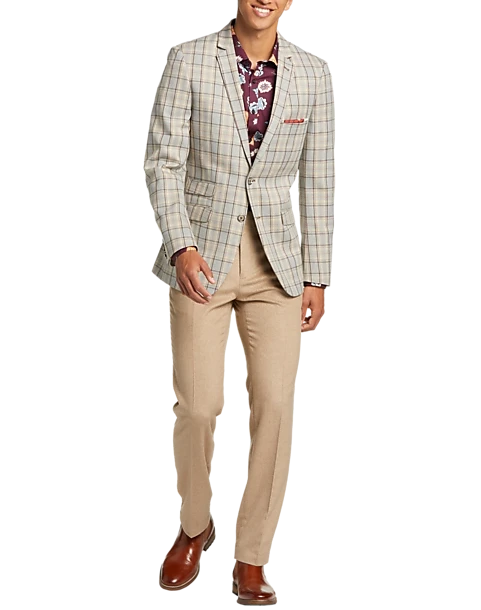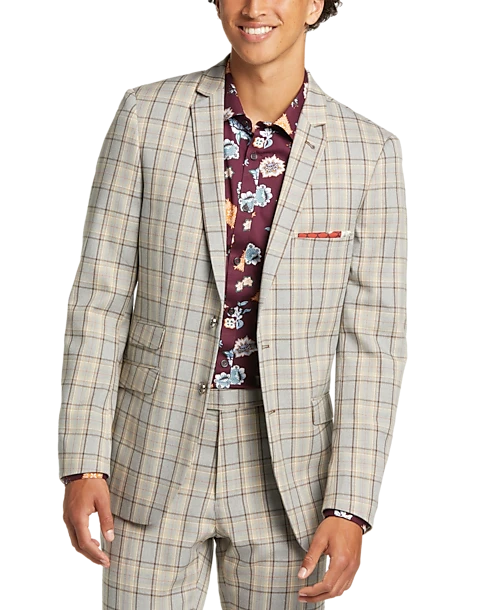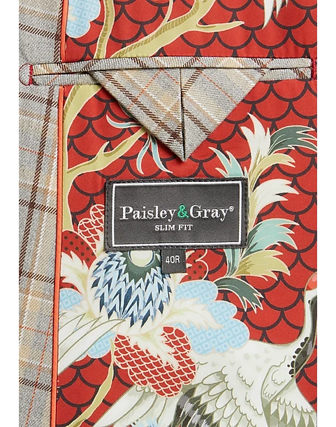 - 64% polyester 34% rayon 2% spandex|Two button|Notch lapel|Side vents|Contrast lining|Coordinating pieces sold separately|Slim Fit|Paisley & Gray|