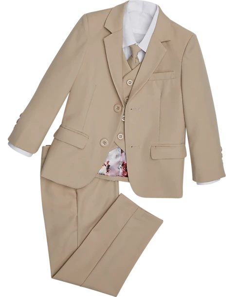 Dress your little gentleman in big guy style with this five-piece complete tuxedo set. Tailored with a Slim Fit, this stylish children’s suit is perfect for weddings, especially for ringbearers, and any other formal wear occasion. This handsome collection features a dress shirt, pre-tied tie, vest, coat, and slacks.