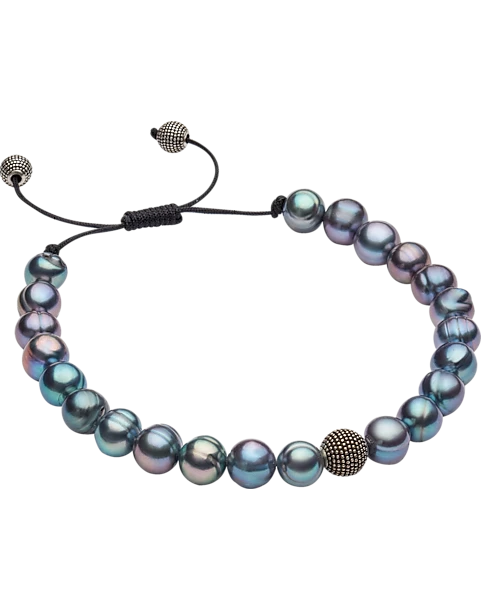 Luminous gray freshwater pearls with a brass bead at the center make a striking statement on this adjustable bracelet from Pronto Uomo.
