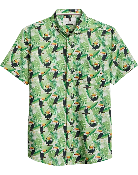 Woven with comfortable four-way stretch fabric, this sport shirt from the Report Collection keeps up with your every move while retaining its shape for the perfect fit. Fashioned with short sleeves and a colorful array of tropical toucan birds, it is both breathable and stylish.