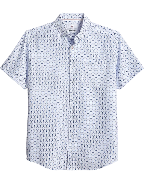 Woven with comfortable four-way stretch fabric, this sport shirt from the Report Collection keeps up with your every move while retaining its shape for the perfect fit. Fashioned with short sleeves and an eye-catching geometric design, it is both breathable and stylish.