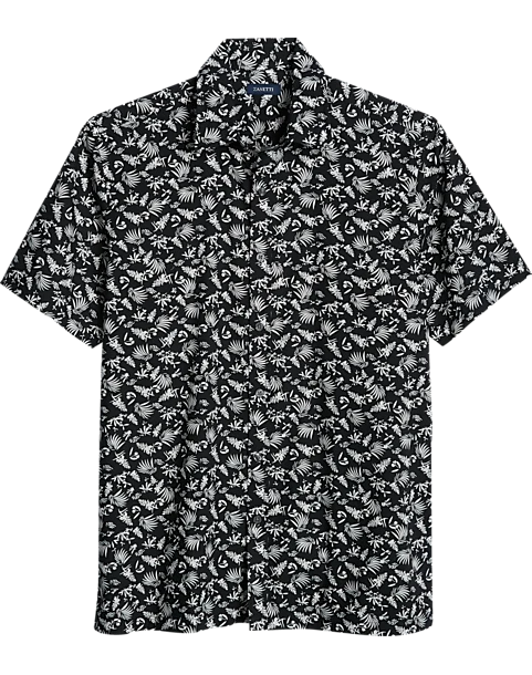 In black with an abstract pattern of florals and palms, this woven cotton camp shirt is as stylish as it is comfortable. Enjoy this short sleeve shirt with shorts, denim or chinos.